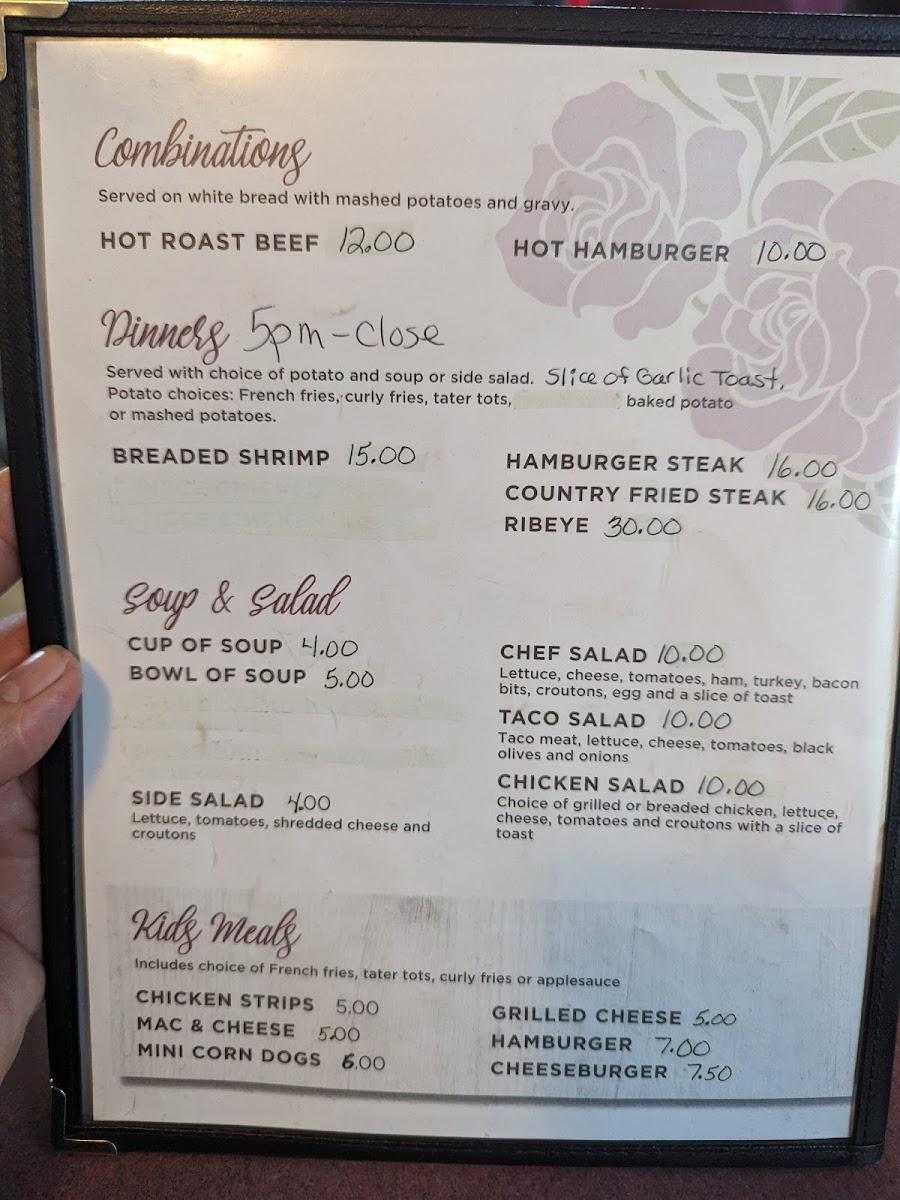 - Dinners: A range of main dishes such as Breaded Shrimp, Hamburger Steak, Country Fried Steak, and Ribeye are available, providing more substantial meal options.